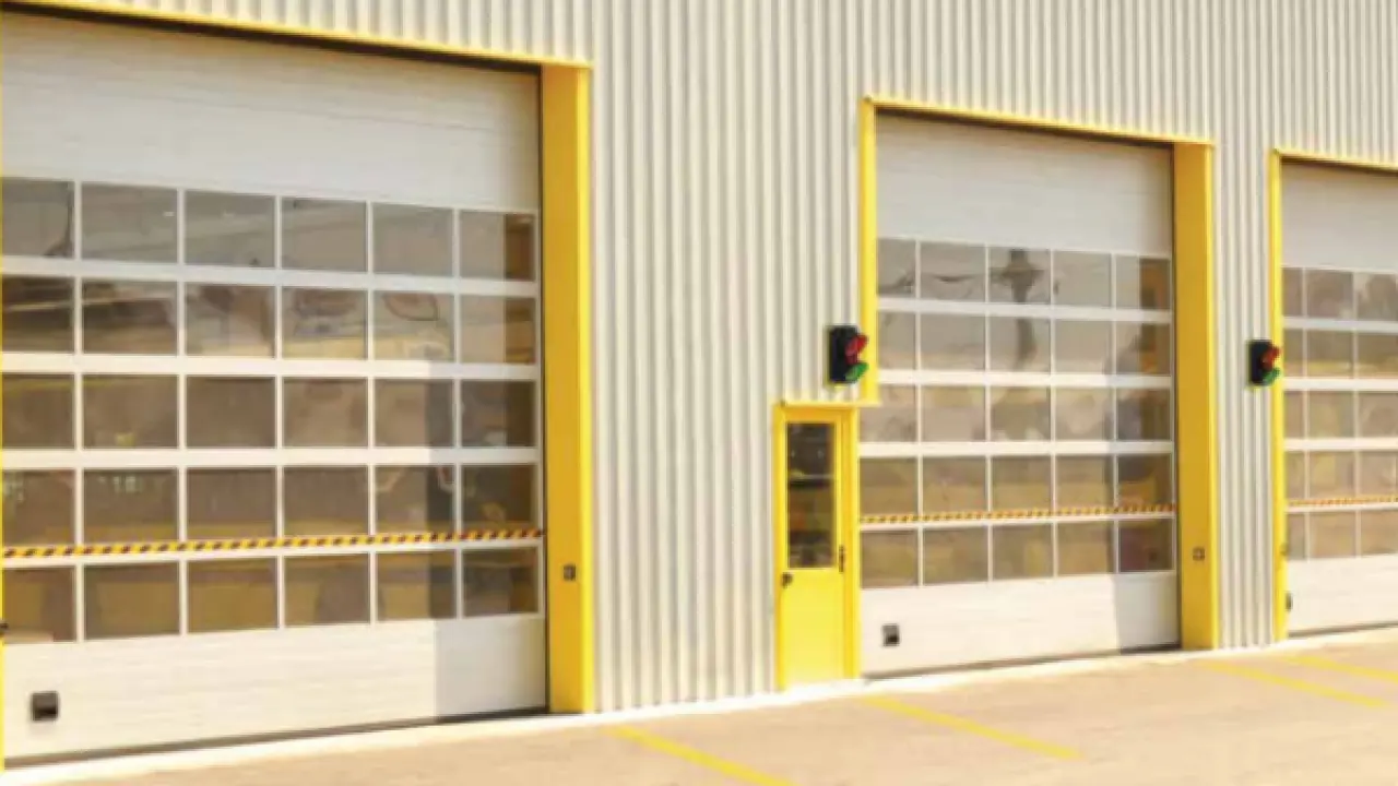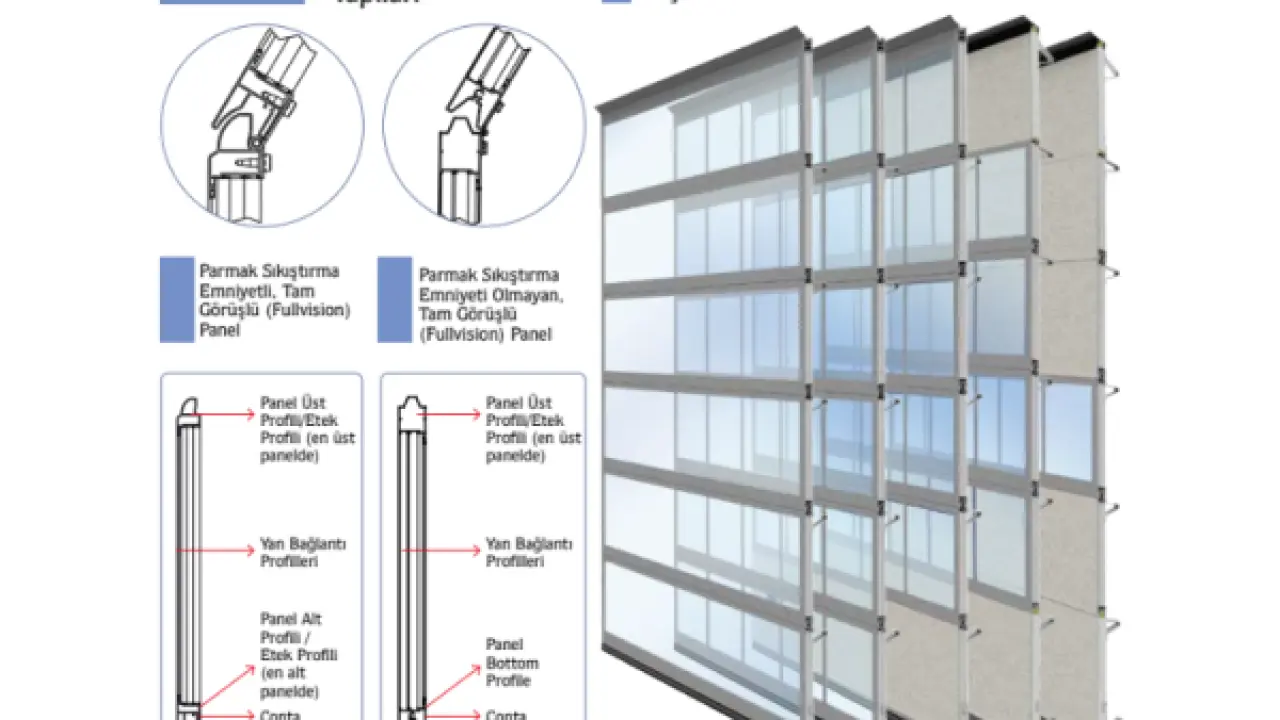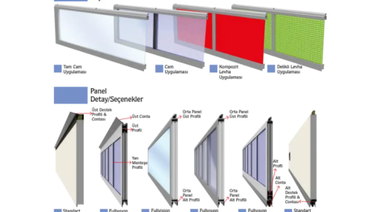 Sistem seri alüminyum çerçeve arası 4 + 12 + 4 mm pleksi’den imal edilmekte olup, görünen alüminyum yüzeyler talep edilen RAL renginde boyalıdır. Tavana doğru kayarak açılan, alüminyum konstrüksiyonlu, tam görüş sağlayan; endüstriyel yapılara, fabrikalara, araç bakım istasyonları ve galerilere uygun işlevsel ve kullanışlı endüstriyel kapılardır. Alüminyum konstrüksiyon içinde kullanılan akrilik camlar kapının şeffaflığını sağlamaktadır. Bu tip kapılarda dolu paneller istendiğinde kullanılabilir ve farklı kombinasyonlar yaratılabilir. Tam görüş sağlayan kapılar istenilen boyutlarda, yapının şekline uygun yataklama seçenekleri ile dayanıklılığı, kolay uygulanabilirliği ve uzun ömürlü kullanımı ile avantajlar sunmaktadır. Ayrıca görselliğin önem kazandığı işletmelerde, işlevselliğinin yanında estetik özellikleri ile de ön plana çıkmaktadır.